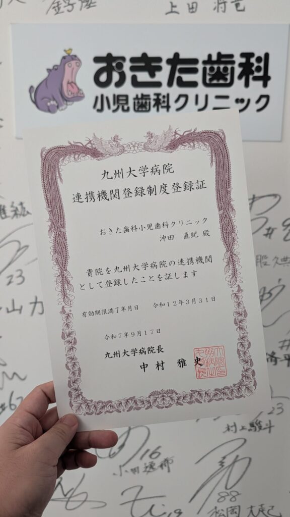 この度、おきた歯科小児歯科クリニックは、「九州大学病院連携機関登録制度」において、九州大学病院の連携医療機関として正式に登録されました。